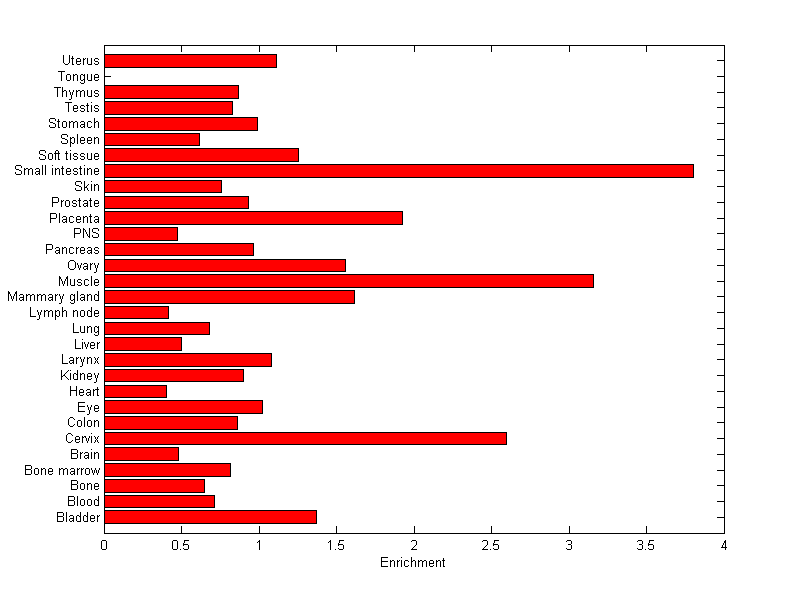 The expression level is normalized with tissue-library size. Each value for a gene in a tissue is a ratio of observed ESTs to the expected one in this tissue. The expected number of ESTs is the product of total ESTs of the gene and the fraction of total ESTs in the tissue among all ESTs in 30 tissues.