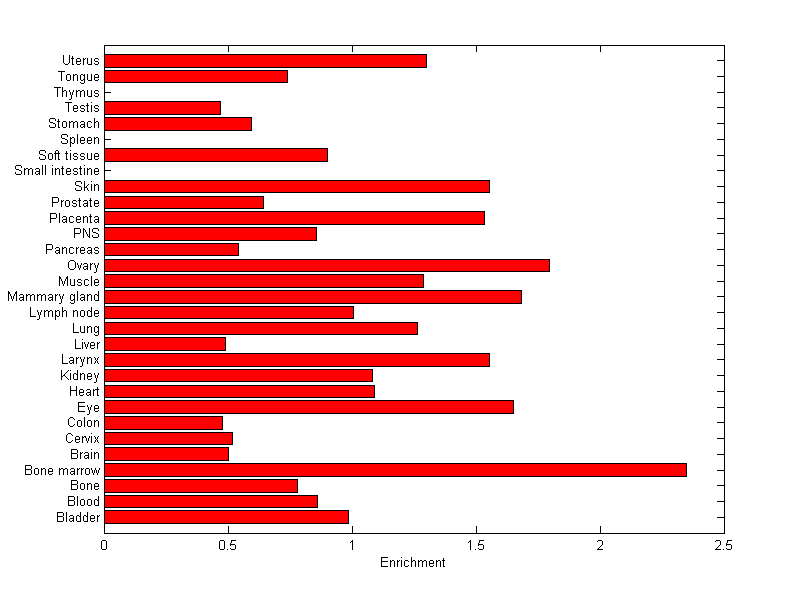 The expression level is normalized with tissue-library size. Each value for a gene in a tissue is a ratio of observed ESTs to the expected one in this tissue. The expected number of ESTs is the product of total ESTs of the gene and the fraction of total ESTs in the tissue among all ESTs in 30 tissues.