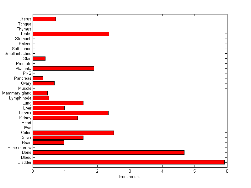 The expression level is normalized with tissue-library size. Each value for a gene in a tissue is a ratio of observed ESTs to the expected one in this tissue. The expected number of ESTs is the product of total ESTs of the gene and the fraction of total ESTs in the tissue among all ESTs in 30 tissues.