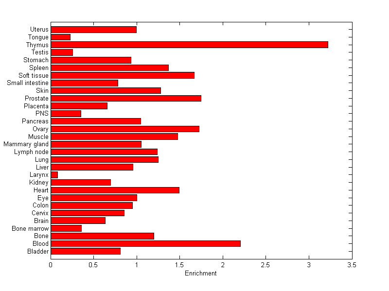 The expression level is normalized with tissue-library size. Each value for a gene in a tissue is a ratio of observed ESTs to the expected one in this tissue. The expected number of ESTs is the product of total ESTs of the gene and the fraction of total ESTs in the tissue among all ESTs in 30 tissues.