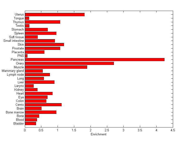 The expression level is normalized with tissue-library size. Each value for a gene in a tissue is a ratio of observed ESTs to the expected one in this tissue. The expected number of ESTs is the product of total ESTs of the gene and the fraction of total ESTs in the tissue among all ESTs in 30 tissues.
