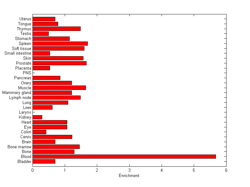 The expression level is normalized with tissue-library size. Each value for a gene in a tissue is a ratio of observed ESTs to the expected one in this tissue. The expected number of ESTs is the product of total ESTs of the gene and the fraction of total ESTs in the tissue among all ESTs in 30 tissues.
