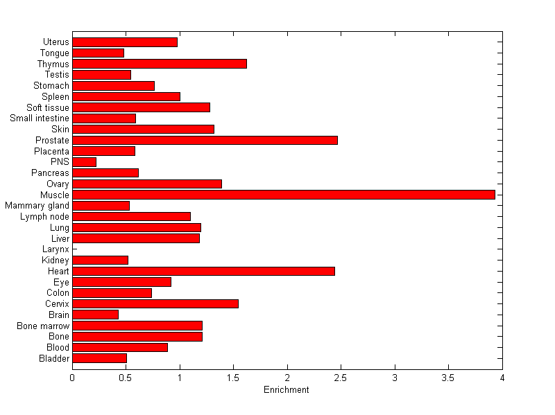 The expression level is normalized with tissue-library size. Each value for a gene in a tissue is a ratio of observed ESTs to the expected one in this tissue. The expected number of ESTs is the product of total ESTs of the gene and the fraction of total ESTs in the tissue among all ESTs in 30 tissues.