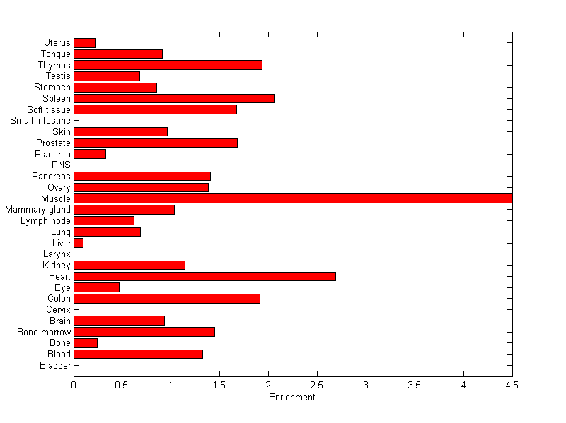 The expression level is normalized with tissue-library size. Each value for a gene in a tissue is a ratio of observed ESTs to the expected one in this tissue. The expected number of ESTs is the product of total ESTs of the gene and the fraction of total ESTs in the tissue among all ESTs in 30 tissues.