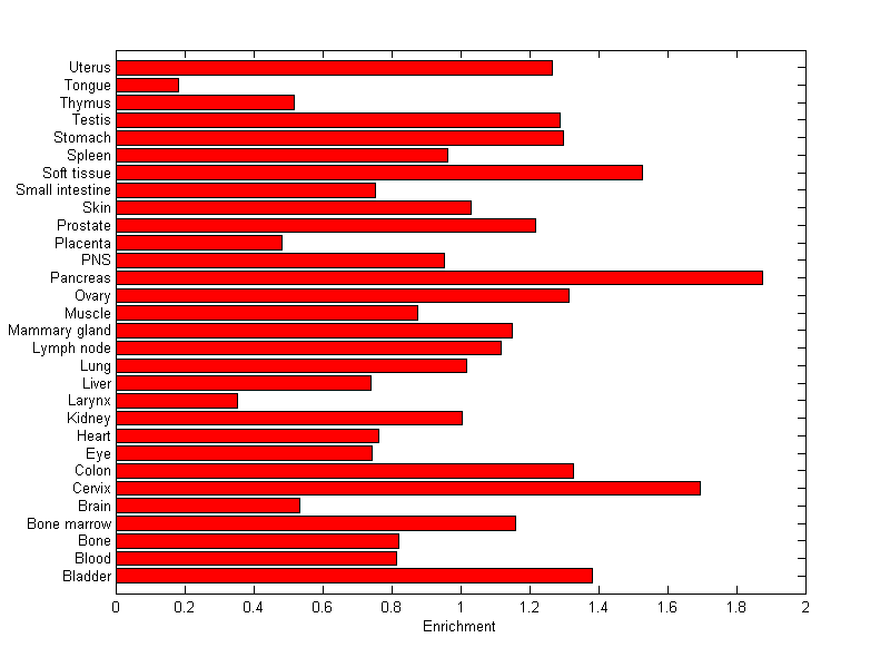 The expression level is normalized with tissue-library size. Each value for a gene in a tissue is a ratio of observed ESTs to the expected one in this tissue. The expected number of ESTs is the product of total ESTs of the gene and the fraction of total ESTs in the tissue among all ESTs in 30 tissues.