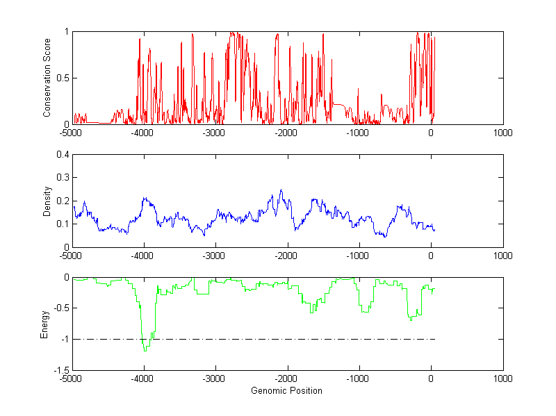 About the profiles: The conservation profile (red curve) is about conservation scores of the promoter sequences. Conservation was determined from an eight-way alignment of human, chimpanzee, dog, mouse, rat, chicken, zebrafish and fugu sequences. The conservation was quantified by a conservation score between 0 and 1, with 1 as highest conservation. The conservation score was obtained from UCSC genome databases. The density profile (blue curve) is about density of all TF binding sites. The energy profile (green curve) is about energy for module detection based on TF interaction. The positions with energy less than -1 indicate the existence of CRMs. Download: Conservation profileDensity profile Energy profile CRM summary |
