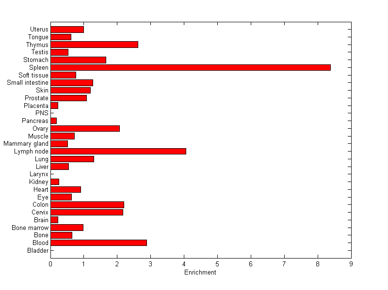 About the profile: The expression level is normalized with tissue-library size. Each value for a gene in a tissue is a ratio of observed ESTs to the expected one in this tissue. The expected number of ESTs is the product of total ESTs of the gene and the fraction of total ESTs in the tissue among all ESTs in 30 tissues. Summary: This gene is preferentially expressed in [spleen] Download: |