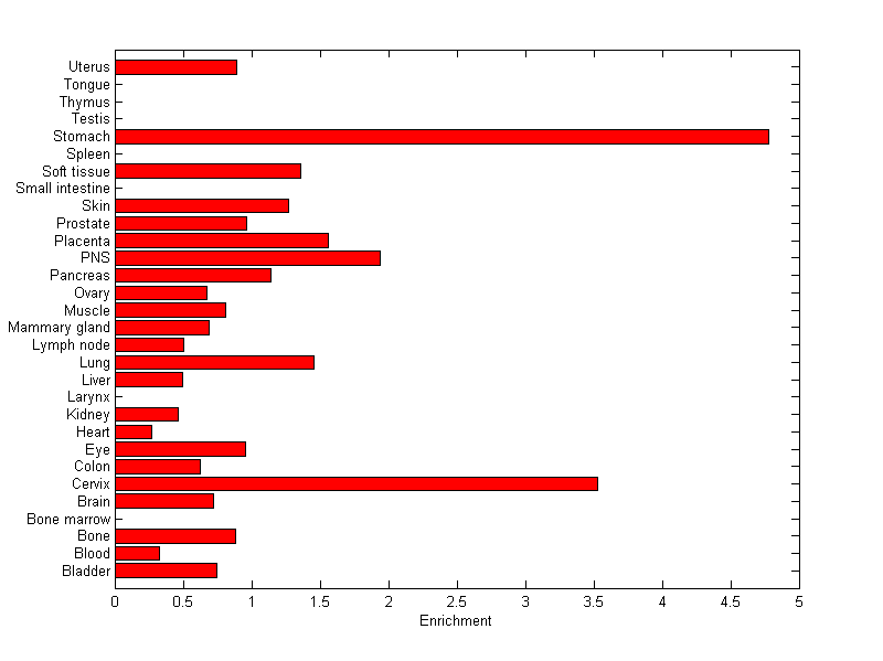 The expression level is normalized with tissue-library size. Each value for a gene in a tissue is a ratio of observed ESTs to the expected one in this tissue. The expected number of ESTs is the product of total ESTs of the gene and the fraction of total ESTs in the tissue among all ESTs in 30 tissues.