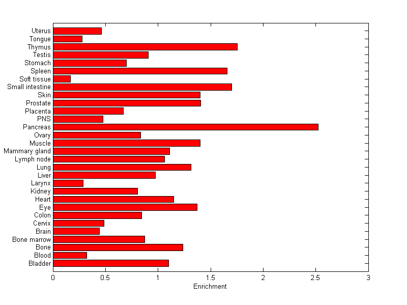 The expression level is normalized with tissue-library size. Each value for a gene in a tissue is a ratio of observed ESTs to the expected one in this tissue. The expected number of ESTs is the product of total ESTs of the gene and the fraction of total ESTs in the tissue among all ESTs in 30 tissues.