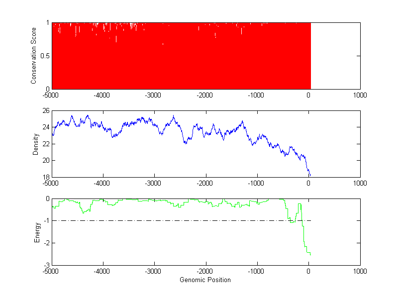 About the profiles: The conservation profile (red curve) is about conservation scores of the promoter sequences. Conservation was determined from an eight-way alignment of human, chimpanzee, dog, mouse, rat, chicken, zebrafish and fugu sequences. The conservation was quantified by a conservation score between 0 and 1, with 1 as highest conservation. The conservation score was obtained from UCSC genome databases. The density profile (blue curve) is about density of all TF binding sites. The energy profile (green curve) is about energy for module detection based on TF interaction. The positions with energy less than -1 indicate the existence of CRMs. Download: Conservation profileDensity profile Energy profile CRM summary |