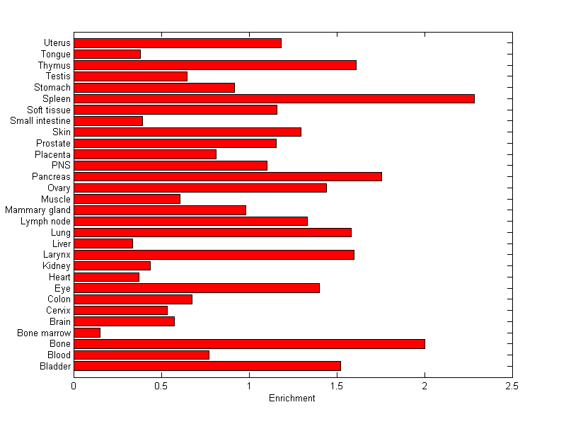 About the profile: The expression level is normalized with tissue-library size. Each value for a gene in a tissue is a ratio of observed ESTs to the expected one in this tissue. The expected number of ESTs is the product of total ESTs of the gene and the fraction of total ESTs in the tissue among all ESTs in 30 tissues. Download: |