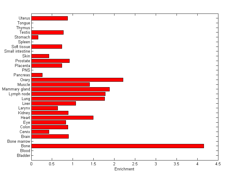 The expression level is normalized with tissue-library size. Each value for a gene in a tissue is a ratio of observed ESTs to the expected one in this tissue. The expected number of ESTs is the product of total ESTs of the gene and the fraction of total ESTs in the tissue among all ESTs in 30 tissues.