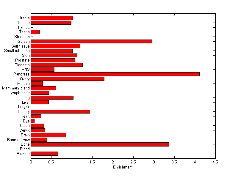 The expression level is normalized with tissue-library size. Each value for a gene in a tissue is a ratio of observed ESTs to the expected one in this tissue. The expected number of ESTs is the product of total ESTs of the gene and the fraction of total ESTs in the tissue among all ESTs in 30 tissues.