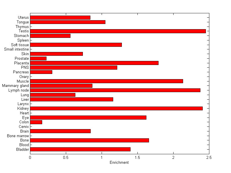 The expression level is normalized with tissue-library size. Each value for a gene in a tissue is a ratio of observed ESTs to the expected one in this tissue. The expected number of ESTs is the product of total ESTs of the gene and the fraction of total ESTs in the tissue among all ESTs in 30 tissues.