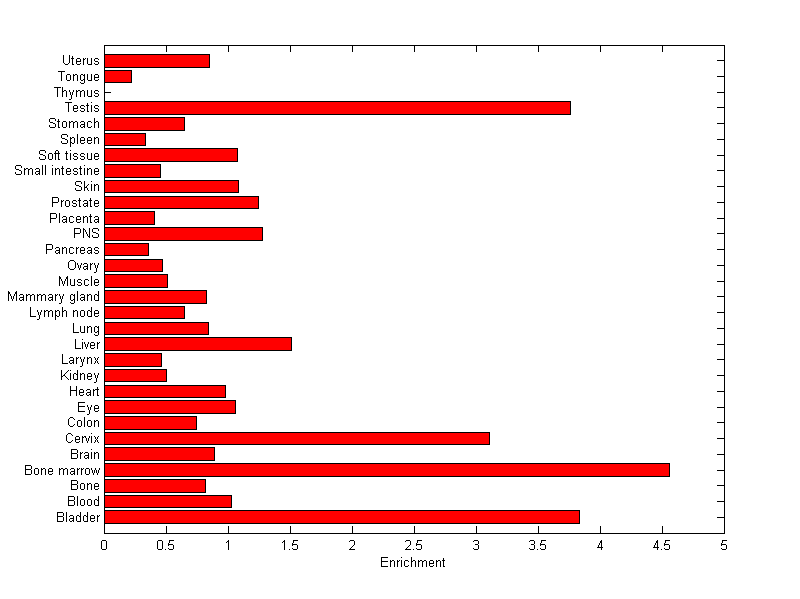 The expression level is normalized with tissue-library size. Each value for a gene in a tissue is a ratio of observed ESTs to the expected one in this tissue. The expected number of ESTs is the product of total ESTs of the gene and the fraction of total ESTs in the tissue among all ESTs in 30 tissues.