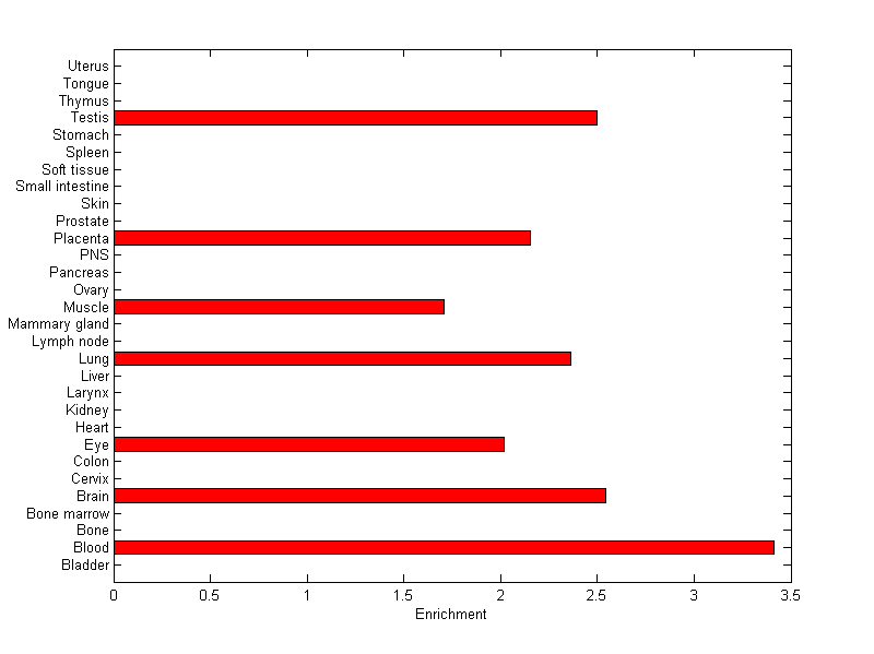 The expression level is normalized with tissue-library size. Each value for a gene in a tissue is a ratio of observed ESTs to the expected one in this tissue. The expected number of ESTs is the product of total ESTs of the gene and the fraction of total ESTs in the tissue among all ESTs in 30 tissues.