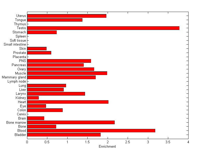 The expression level is normalized with tissue-library size. Each value for a gene in a tissue is a ratio of observed ESTs to the expected one in this tissue. The expected number of ESTs is the product of total ESTs of the gene and the fraction of total ESTs in the tissue among all ESTs in 30 tissues.