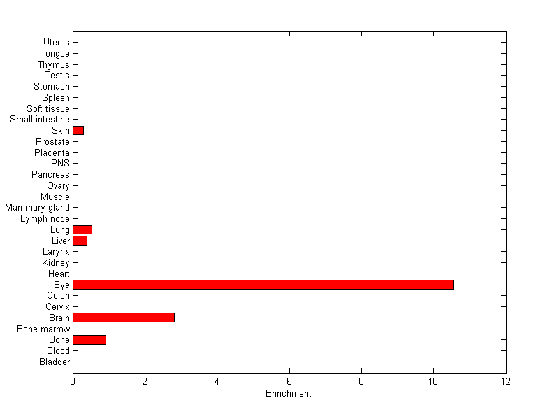 The expression level is normalized with tissue-library size. Each value for a gene in a tissue is a ratio of observed ESTs to the expected one in this tissue. The expected number of ESTs is the product of total ESTs of the gene and the fraction of total ESTs in the tissue among all ESTs in 30 tissues.