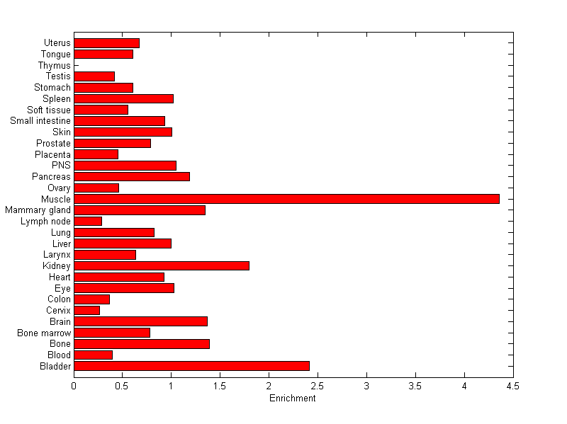 The expression level is normalized with tissue-library size. Each value for a gene in a tissue is a ratio of observed ESTs to the expected one in this tissue. The expected number of ESTs is the product of total ESTs of the gene and the fraction of total ESTs in the tissue among all ESTs in 30 tissues.