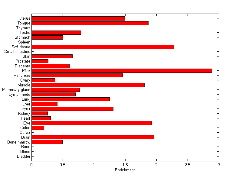The expression level is normalized with tissue-library size. Each value for a gene in a tissue is a ratio of observed ESTs to the expected one in this tissue. The expected number of ESTs is the product of total ESTs of the gene and the fraction of total ESTs in the tissue among all ESTs in 30 tissues.