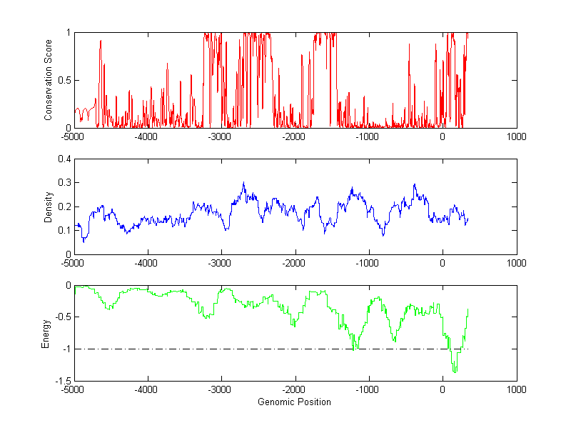 The energy profile (green curve) is about energy for module detection based on TF interaction. The positions with energy less than -1 indicate the existence of CRMs.