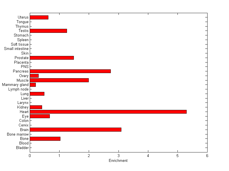 The expression level is normalized with tissue-library size. Each value for a gene in a tissue is a ratio of observed ESTs to the expected one in this tissue. The expected number of ESTs is the product of total ESTs of the gene and the fraction of total ESTs in the tissue among all ESTs in 30 tissues.