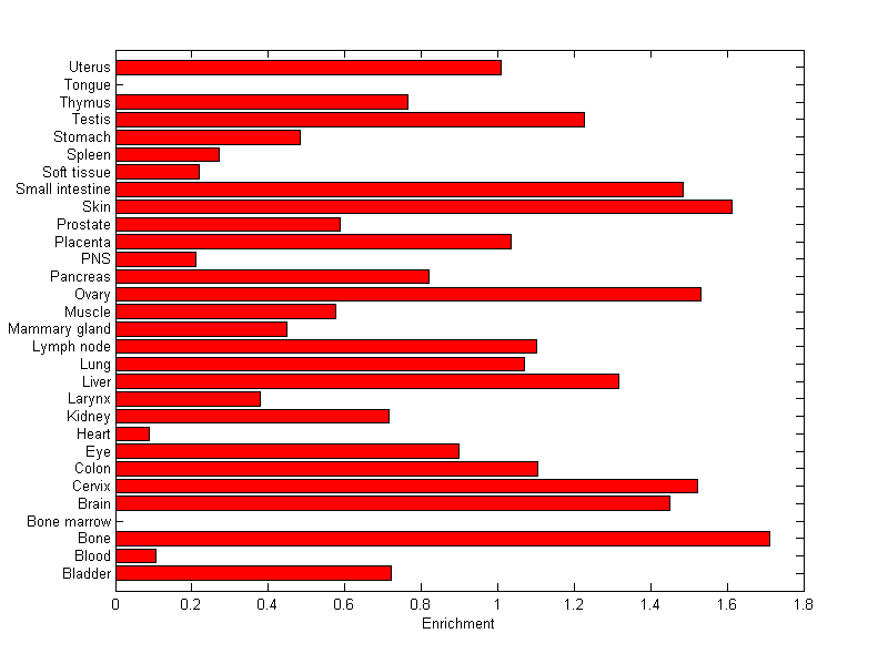 The expression level is normalized with tissue-library size. Each value for a gene in a tissue is a ratio of observed ESTs to the expected one in this tissue. The expected number of ESTs is the product of total ESTs of the gene and the fraction of total ESTs in the tissue among all ESTs in 30 tissues.