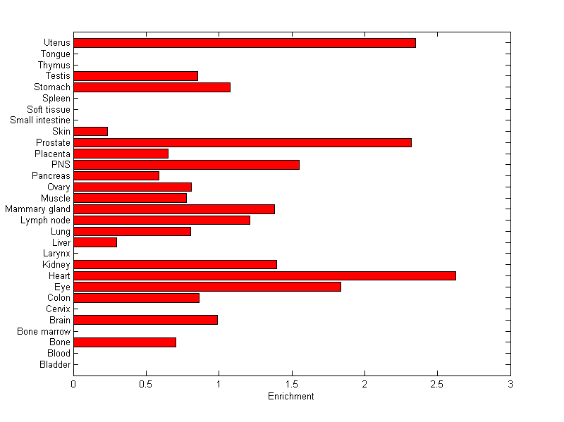 The expression level is normalized with tissue-library size. Each value for a gene in a tissue is a ratio of observed ESTs to the expected one in this tissue. The expected number of ESTs is the product of total ESTs of the gene and the fraction of total ESTs in the tissue among all ESTs in 30 tissues.