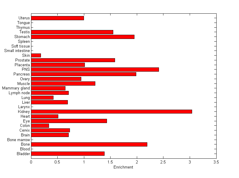 The expression level is normalized with tissue-library size. Each value for a gene in a tissue is a ratio of observed ESTs to the expected one in this tissue. The expected number of ESTs is the product of total ESTs of the gene and the fraction of total ESTs in the tissue among all ESTs in 30 tissues.