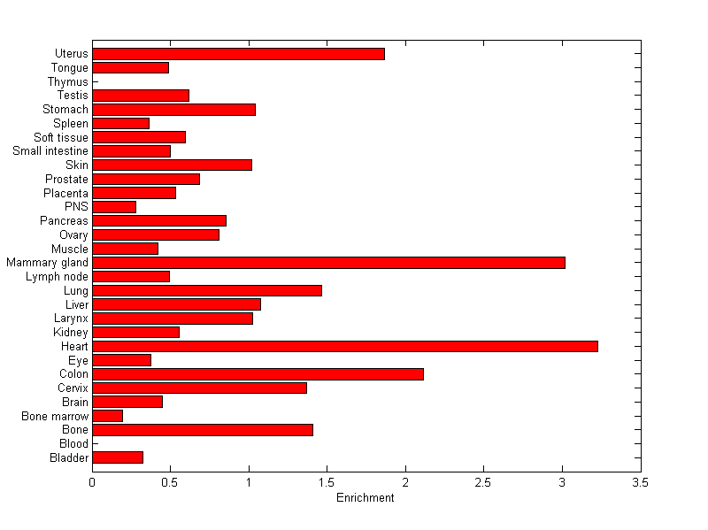 The expression level is normalized with tissue-library size. Each value for a gene in a tissue is a ratio of observed ESTs to the expected one in this tissue. The expected number of ESTs is the product of total ESTs of the gene and the fraction of total ESTs in the tissue among all ESTs in 30 tissues.