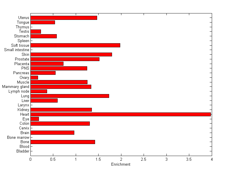The expression level is normalized with tissue-library size. Each value for a gene in a tissue is a ratio of observed ESTs to the expected one in this tissue. The expected number of ESTs is the product of total ESTs of the gene and the fraction of total ESTs in the tissue among all ESTs in 30 tissues.