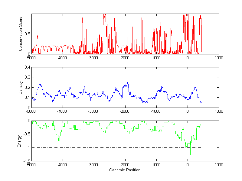 The conservation profile (red curve) is about conservation scores of the promoter sequences. Conservation was determined from an eight-way alignment of human, chimpanzee, dog, mouse, rat, chicken, zebrafish and fugu sequences. The conservation was quantified by a conservation score between 0 and 1, with 1 as highest conservation. The conservation score was obtained from UCSC genome databases.