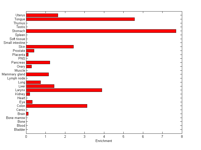 The expression level is normalized with tissue-library size. Each value for a gene in a tissue is a ratio of observed ESTs to the expected one in this tissue. The expected number of ESTs is the product of total ESTs of the gene and the fraction of total ESTs in the tissue among all ESTs in 30 tissues.
