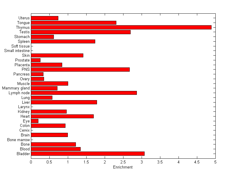 The expression level is normalized with tissue-library size. Each value for a gene in a tissue is a ratio of observed ESTs to the expected one in this tissue. The expected number of ESTs is the product of total ESTs of the gene and the fraction of total ESTs in the tissue among all ESTs in 30 tissues.