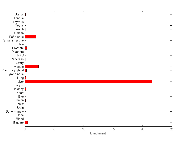 The expression level is normalized with tissue-library size. Each value for a gene in a tissue is a ratio of observed ESTs to the expected one in this tissue. The expected number of ESTs is the product of total ESTs of the gene and the fraction of total ESTs in the tissue among all ESTs in 30 tissues.