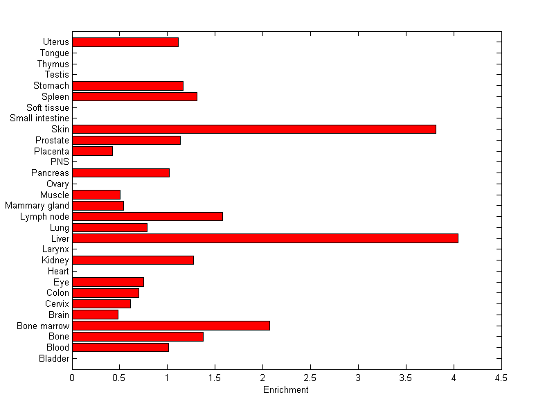 The expression level is normalized with tissue-library size. Each value for a gene in a tissue is a ratio of observed ESTs to the expected one in this tissue. The expected number of ESTs is the product of total ESTs of the gene and the fraction of total ESTs in the tissue among all ESTs in 30 tissues.