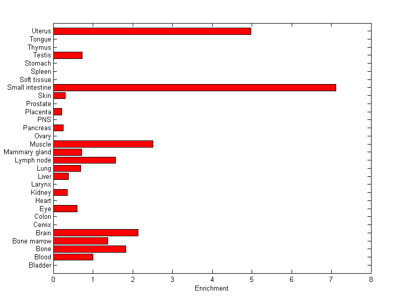 The expression level is normalized with tissue-library size. Each value for a gene in a tissue is a ratio of observed ESTs to the expected one in this tissue. The expected number of ESTs is the product of total ESTs of the gene and the fraction of total ESTs in the tissue among all ESTs in 30 tissues.