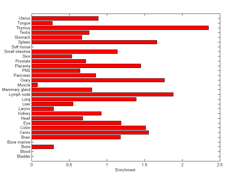 The expression level is normalized with tissue-library size. Each value for a gene in a tissue is a ratio of observed ESTs to the expected one in this tissue. The expected number of ESTs is the product of total ESTs of the gene and the fraction of total ESTs in the tissue among all ESTs in 30 tissues.