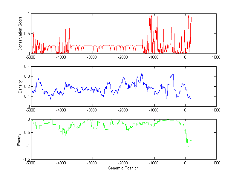 The energy profile (green curve) is about energy for module detection based on TF interaction. The positions with energy less than -1 indicate the existence of CRMs.