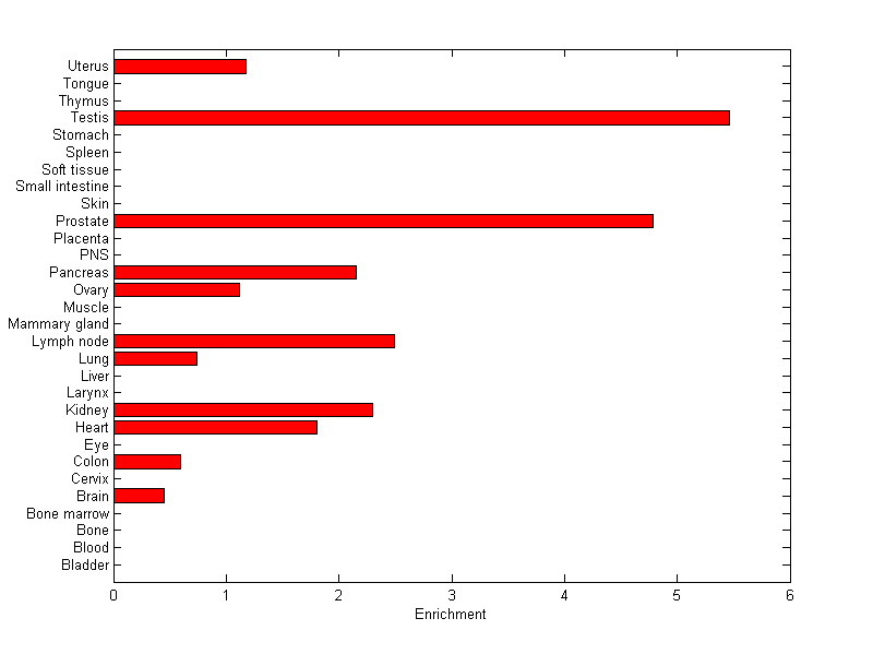The expression level is normalized with tissue-library size. Each value for a gene in a tissue is a ratio of observed ESTs to the expected one in this tissue. The expected number of ESTs is the product of total ESTs of the gene and the fraction of total ESTs in the tissue among all ESTs in 30 tissues.