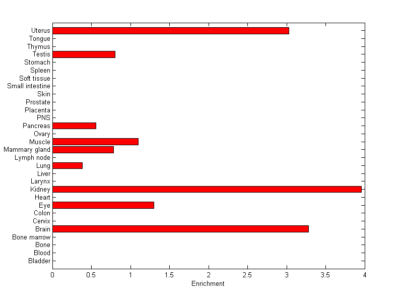 The expression level is normalized with tissue-library size. Each value for a gene in a tissue is a ratio of observed ESTs to the expected one in this tissue. The expected number of ESTs is the product of total ESTs of the gene and the fraction of total ESTs in the tissue among all ESTs in 30 tissues.
