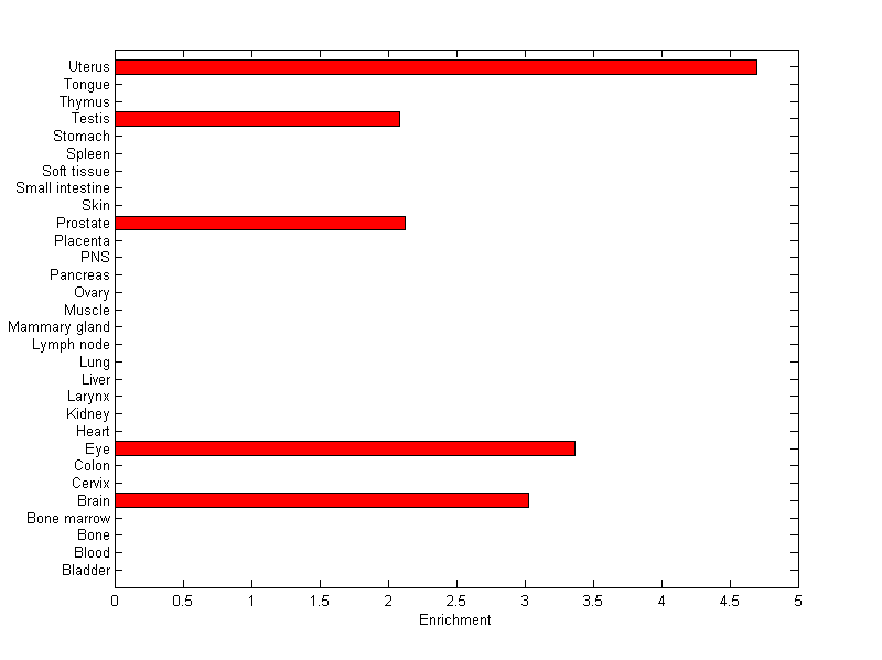 The expression level is normalized with tissue-library size. Each value for a gene in a tissue is a ratio of observed ESTs to the expected one in this tissue. The expected number of ESTs is the product of total ESTs of the gene and the fraction of total ESTs in the tissue among all ESTs in 30 tissues.