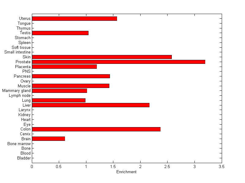 The expression level is normalized with tissue-library size. Each value for a gene in a tissue is a ratio of observed ESTs to the expected one in this tissue. The expected number of ESTs is the product of total ESTs of the gene and the fraction of total ESTs in the tissue among all ESTs in 30 tissues.