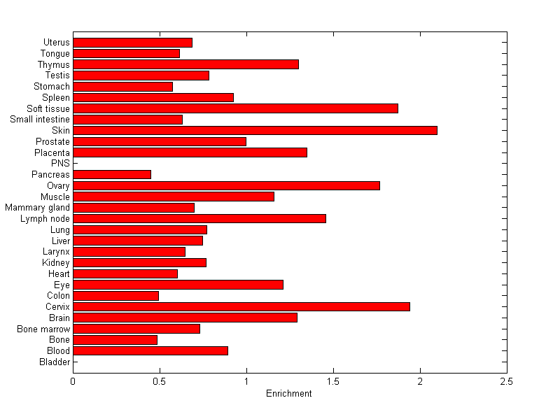 The expression level is normalized with tissue-library size. Each value for a gene in a tissue is a ratio of observed ESTs to the expected one in this tissue. The expected number of ESTs is the product of total ESTs of the gene and the fraction of total ESTs in the tissue among all ESTs in 30 tissues.