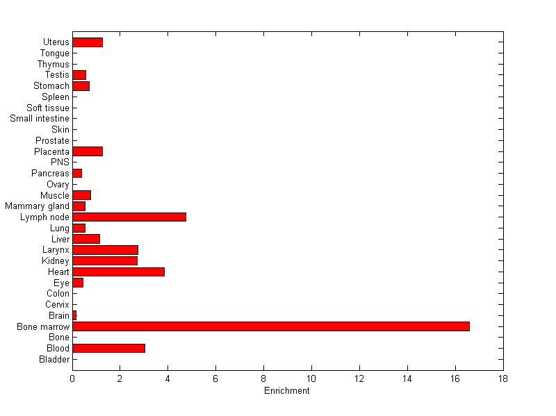 About the profile: The expression level is normalized with tissue-library size. Each value for a gene in a tissue is a ratio of observed ESTs to the expected one in this tissue. The expected number of ESTs is the product of total ESTs of the gene and the fraction of total ESTs in the tissue among all ESTs in 30 tissues. Summary: This gene is preferentially expressed in [bone_marrow] Download: |