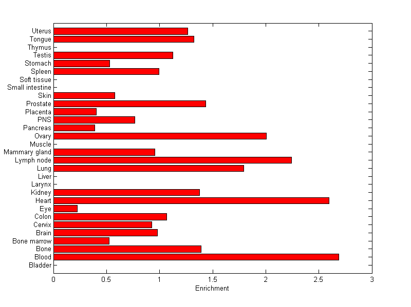 The expression level is normalized with tissue-library size. Each value for a gene in a tissue is a ratio of observed ESTs to the expected one in this tissue. The expected number of ESTs is the product of total ESTs of the gene and the fraction of total ESTs in the tissue among all ESTs in 30 tissues.