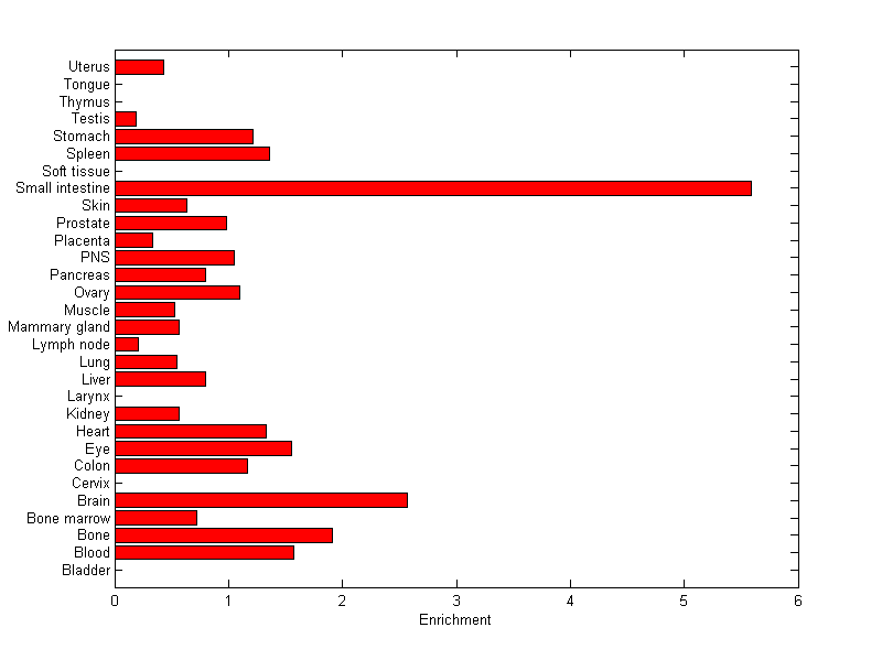 The expression level is normalized with tissue-library size. Each value for a gene in a tissue is a ratio of observed ESTs to the expected one in this tissue. The expected number of ESTs is the product of total ESTs of the gene and the fraction of total ESTs in the tissue among all ESTs in 30 tissues.