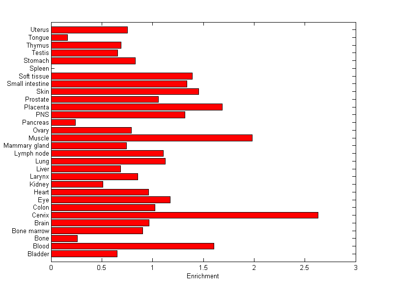 The expression level is normalized with tissue-library size. Each value for a gene in a tissue is a ratio of observed ESTs to the expected one in this tissue. The expected number of ESTs is the product of total ESTs of the gene and the fraction of total ESTs in the tissue among all ESTs in 30 tissues.