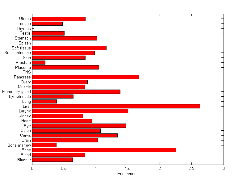 The expression level is normalized with tissue-library size. Each value for a gene in a tissue is a ratio of observed ESTs to the expected one in this tissue. The expected number of ESTs is the product of total ESTs of the gene and the fraction of total ESTs in the tissue among all ESTs in 30 tissues.