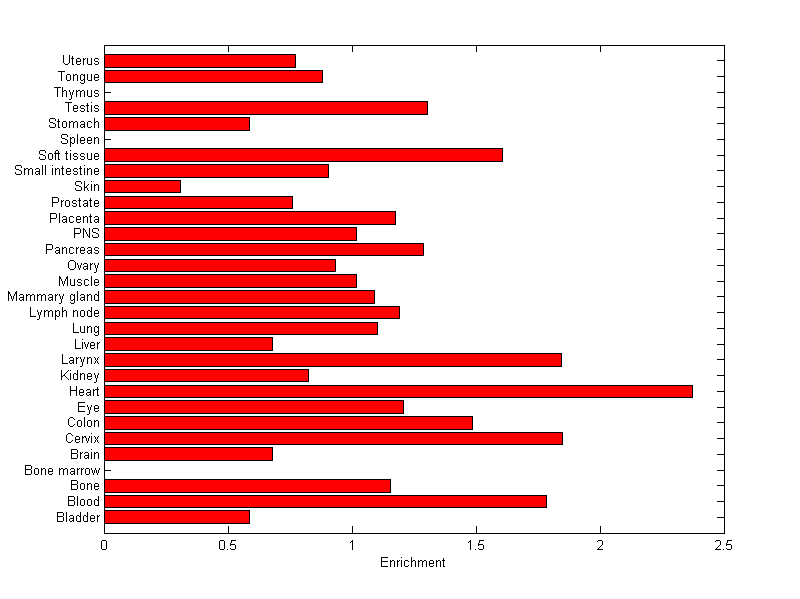 The expression level is normalized with tissue-library size. Each value for a gene in a tissue is a ratio of observed ESTs to the expected one in this tissue. The expected number of ESTs is the product of total ESTs of the gene and the fraction of total ESTs in the tissue among all ESTs in 30 tissues.
